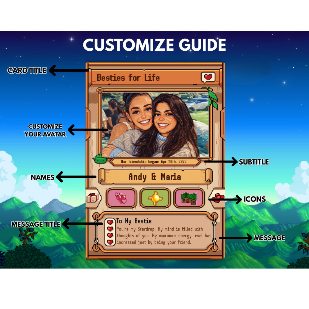 Celebrate your story in a way that’s as one-of-a-kind as your relationship! 💕 Our Card allows you to transform your favorite moments into a charming retro-inspired masterpiece. Whether you’re celebrating an anniversary, a wedding, or just the everyday magic of being together, this card is the perfect keepsake for couples who share a love of gaming, farming, and nostalgia. 🎮💌